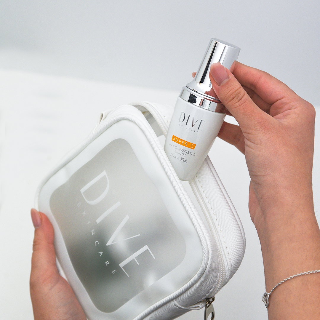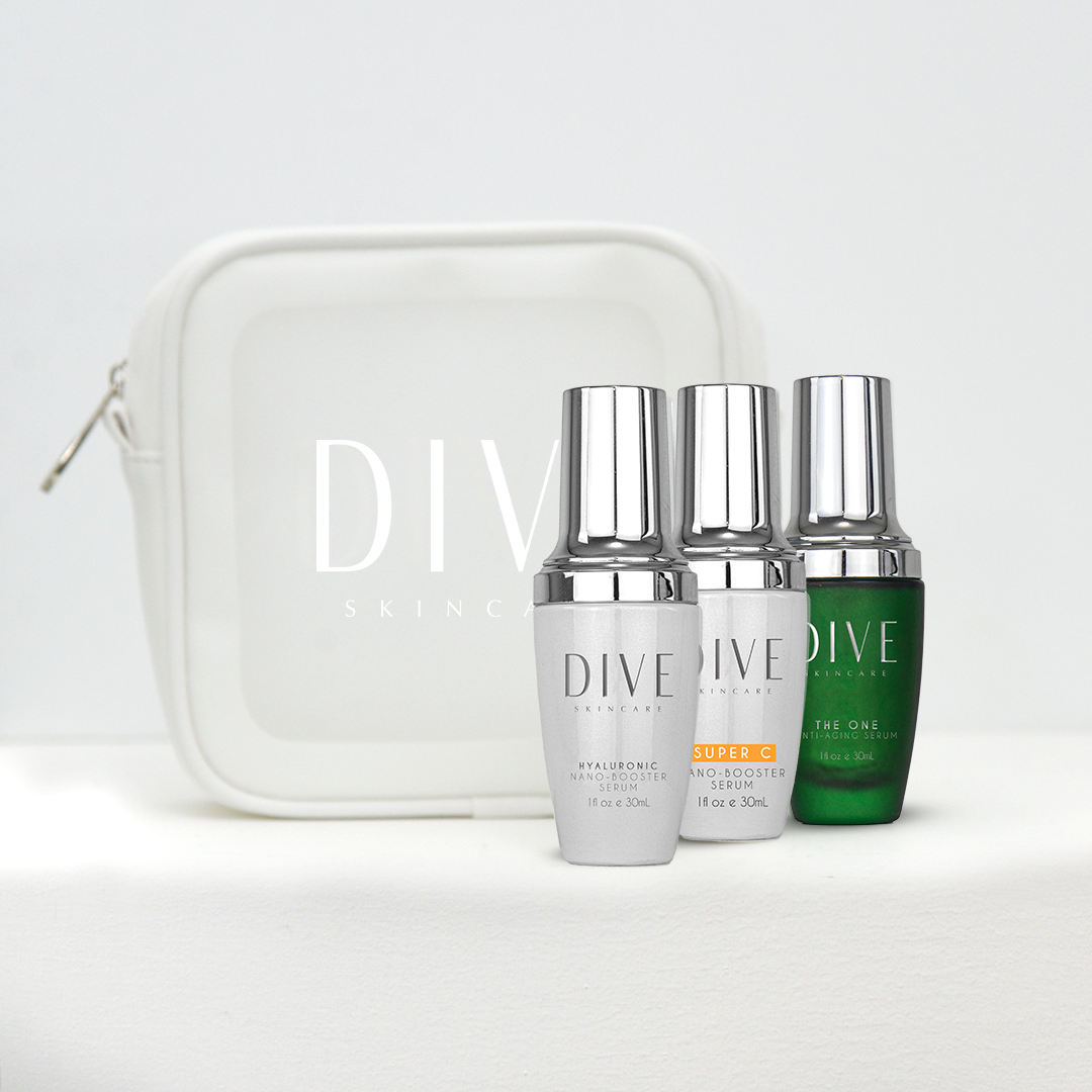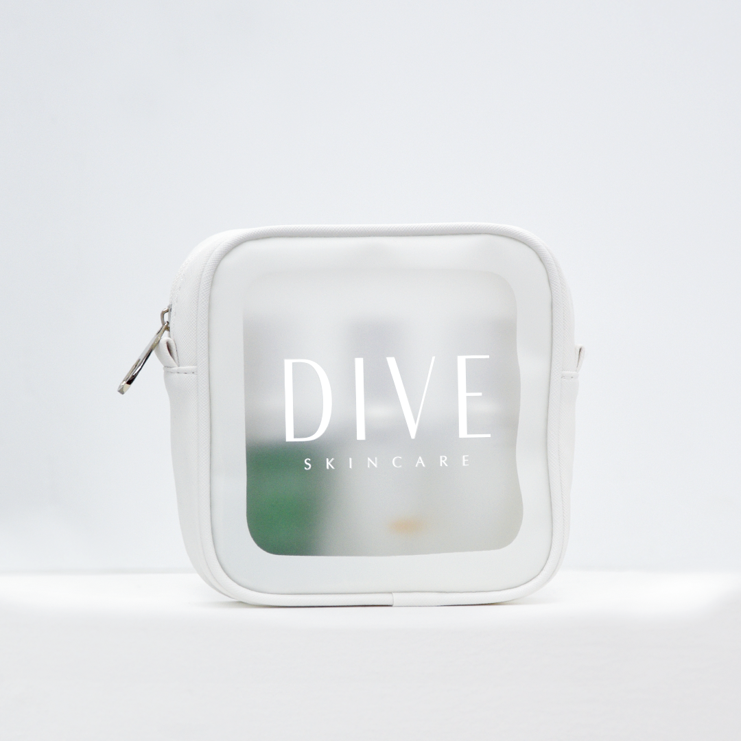 Llévate los 3 productos de lanzamiento de la línea Dive Skincare a un precio especial y recibe de regalo una bolsa cosmetiquera para viaje.